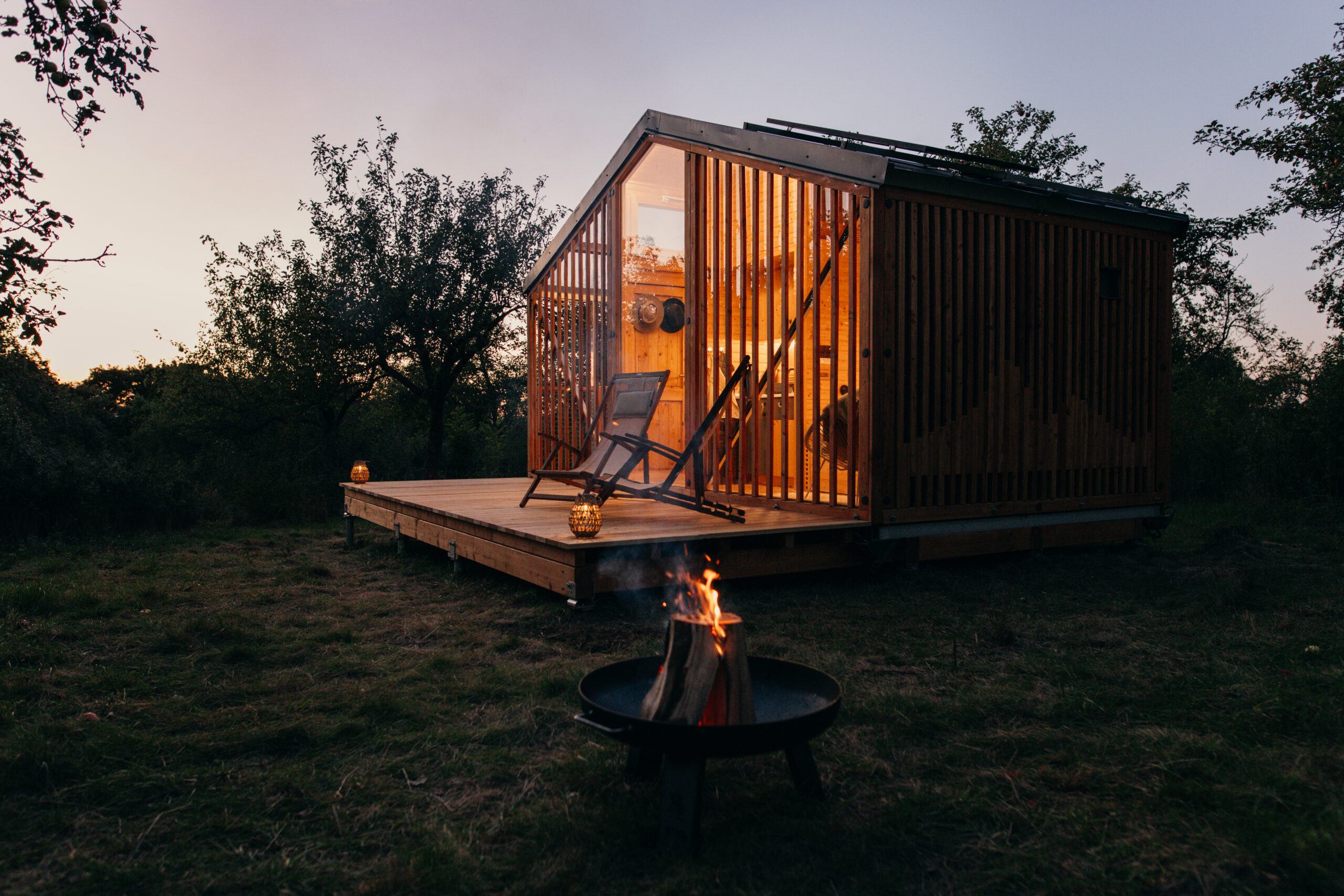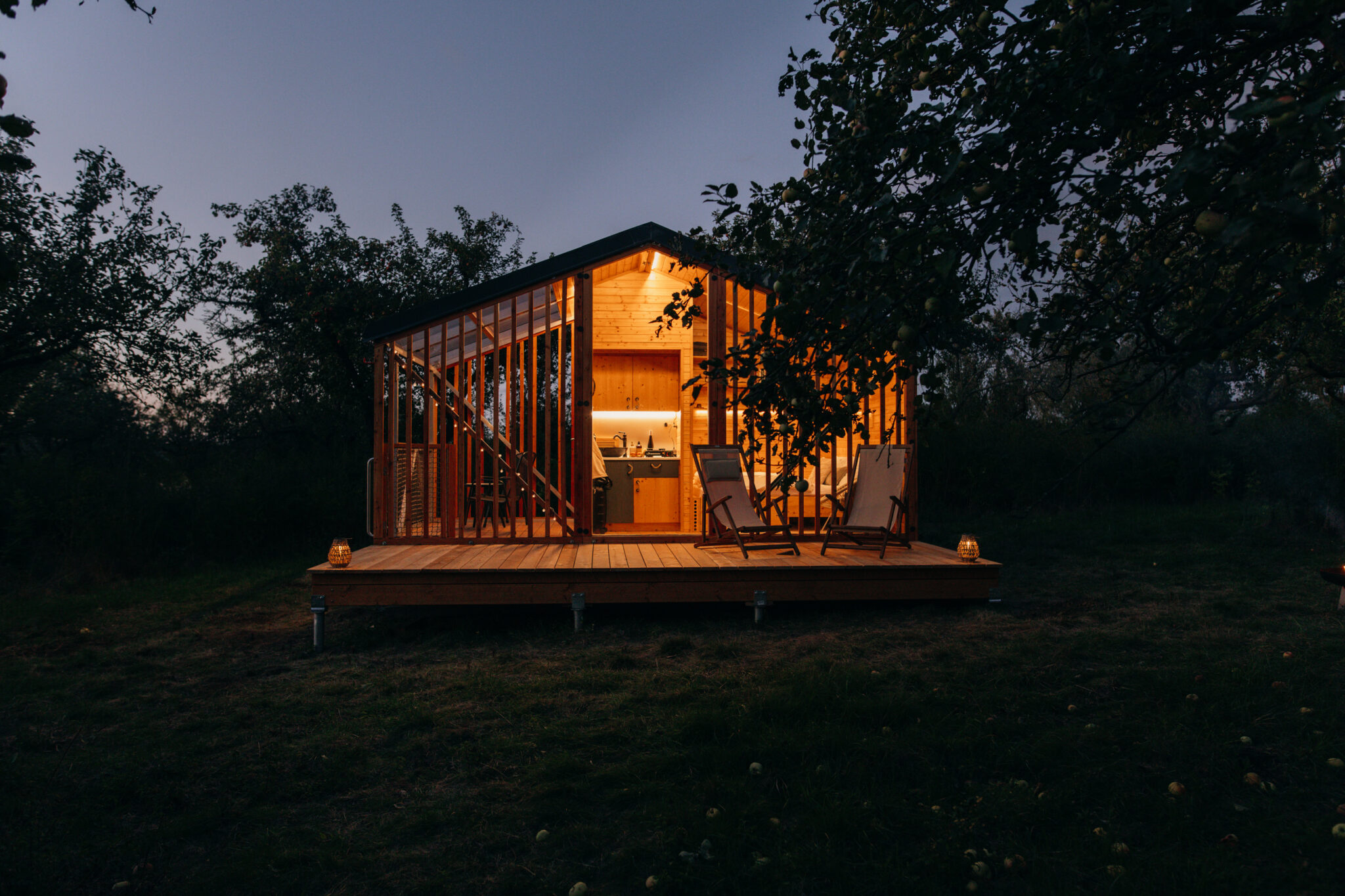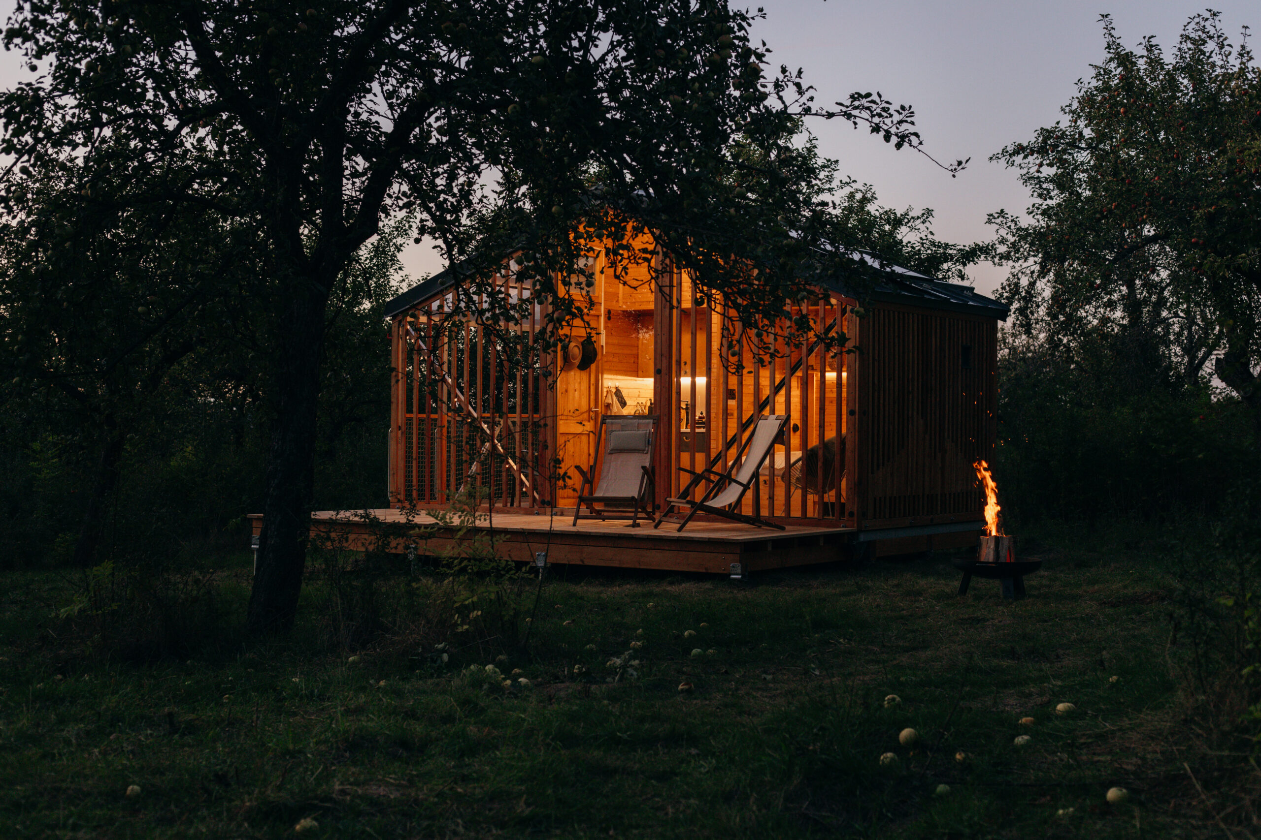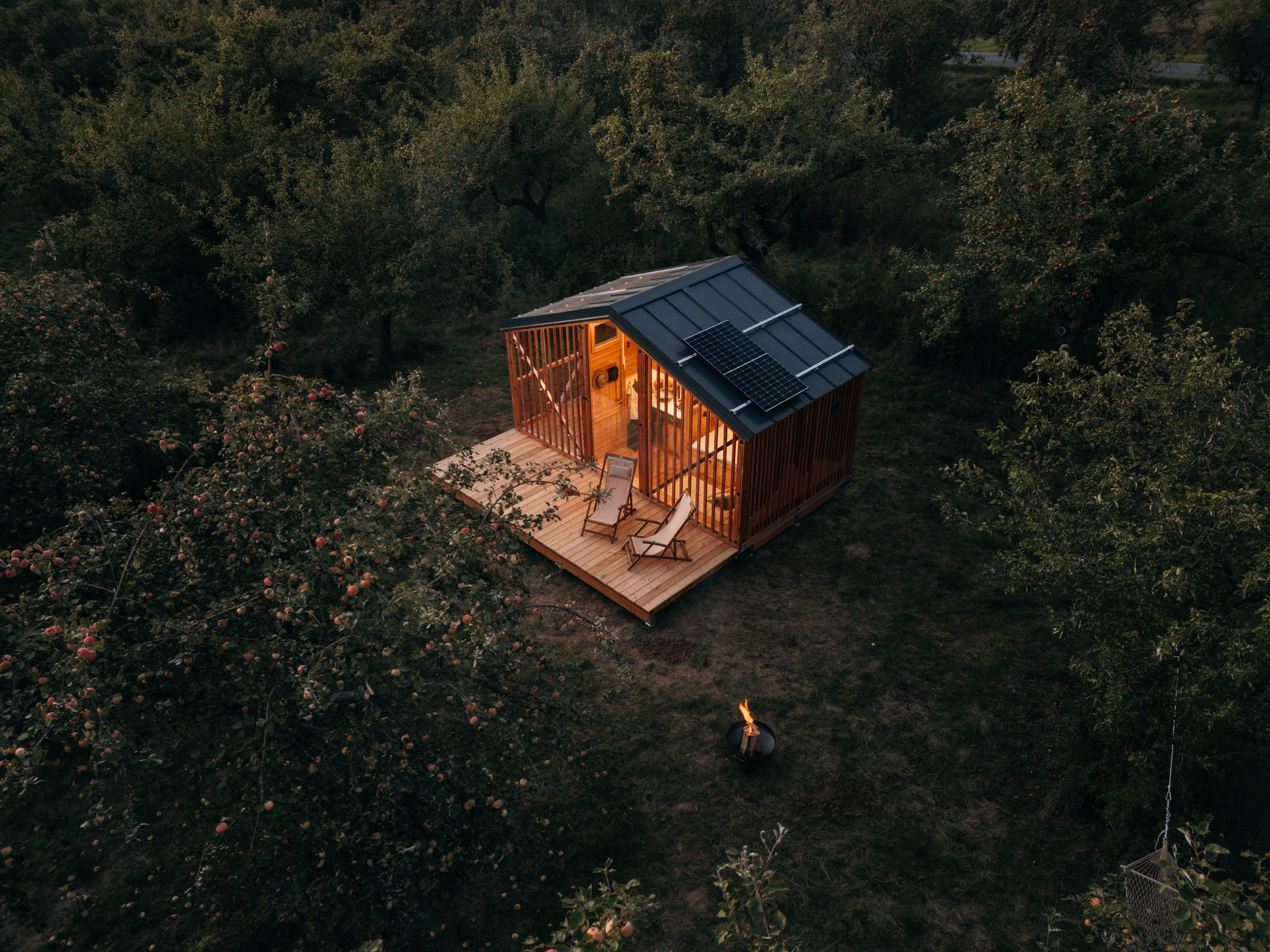 Půl hodiny od Prahy a přitom úplně jiný svět. Naše ootoolna stojí v tichu starého sadu, kde na jaře rozkvétají jemné květy a na podzim dozrává bohatá úroda. Ráno sem mezi jabloně přichází srnky, večer obloha rozzáří tisíce hvězd, které si vychutnáte třeba z houpací sítě zachumlaní v dece.